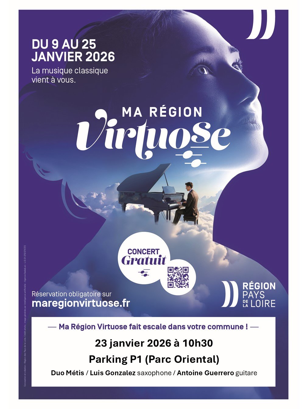 Si vous souhaitez assister au concert de 45 minutes, vous êtes invité à suivre le lien ci-après, vous dirigeant vers la plateforme de réservation en ligne Eventbrite. Vous pourrez y réserver votre billet gratuitement : https://maregionvirtuose-maulevrier.eventbrite.fr