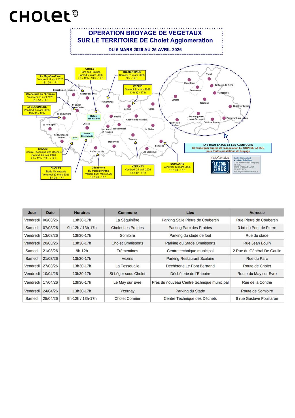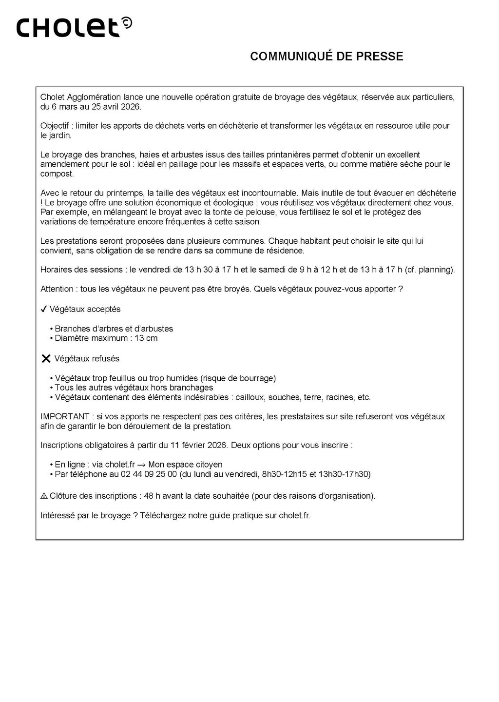 Nous vous informons que la campagne de broyage « Printemps 2026 » à destination des particuliers se déroulera du 6 mars au 25 avril 2026. Les inscriptions en ligne ouvriront à partir du mercredi 11 février 2026.