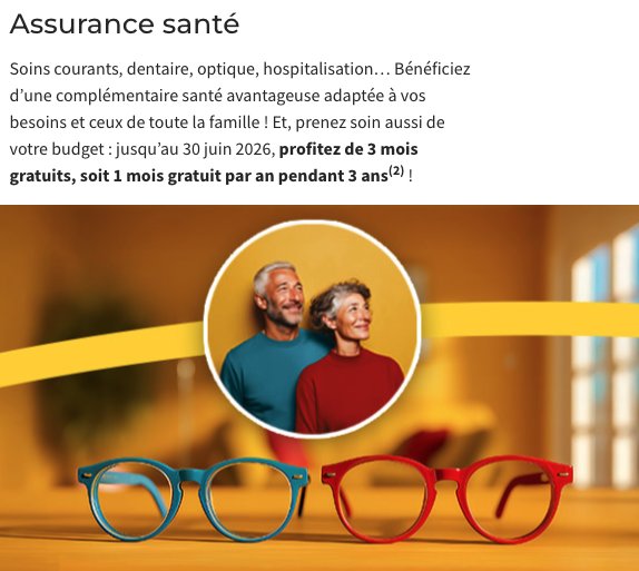 3 mois gratuits jusqu’au 30 juin 2026 -> 1 mois par an pendant 3 ans sur la cotisation de votre contrat Abeille Assurances Santé