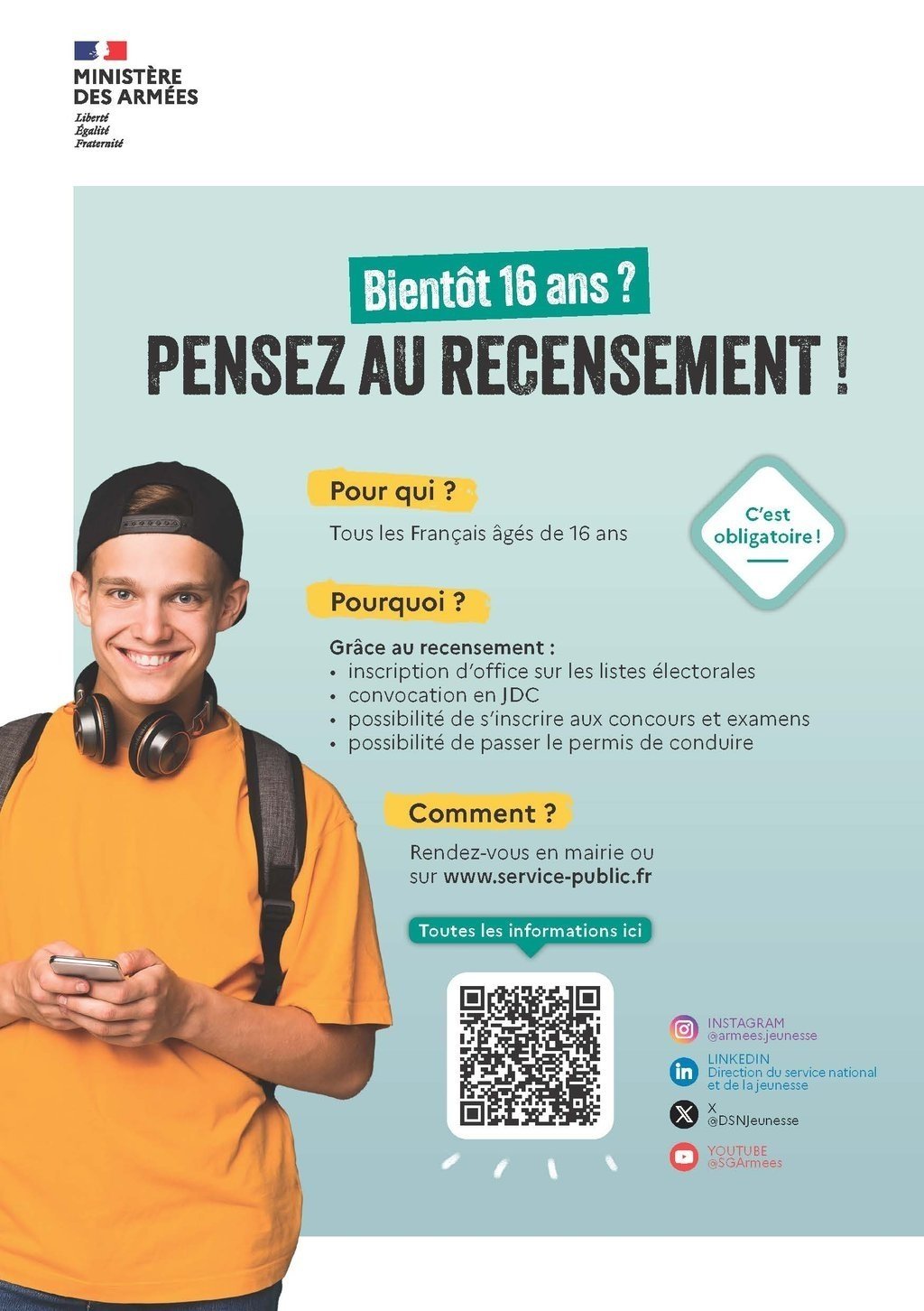 Chaque Français dès 16 ans, qu’il vive en France ou à l'étranger, doit faire le Recensement Citoyen Obligatoire pour ensuite participer à la journée défense et citoyenneté (JDC) et pour pouvoir être inscrit automatiquement sur les listes électorales lors des 18 ans.