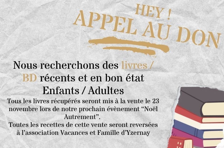 Une collecte de livres en bon et très bon état est organisée par CCPN. Si vous souhaitez faire un tri dans votre bibliothèque, vous pouvez les apporter le samedi le 15 novembre, de 10h30 à 12h au local CCPN (impasse des petits ponts). Ces livres seront mis en vente lors de l'évènement du 23 novembre "Noël Autrement", et les bénéfices seront intégralement reversés à l'association locale "Familles et Vacances".