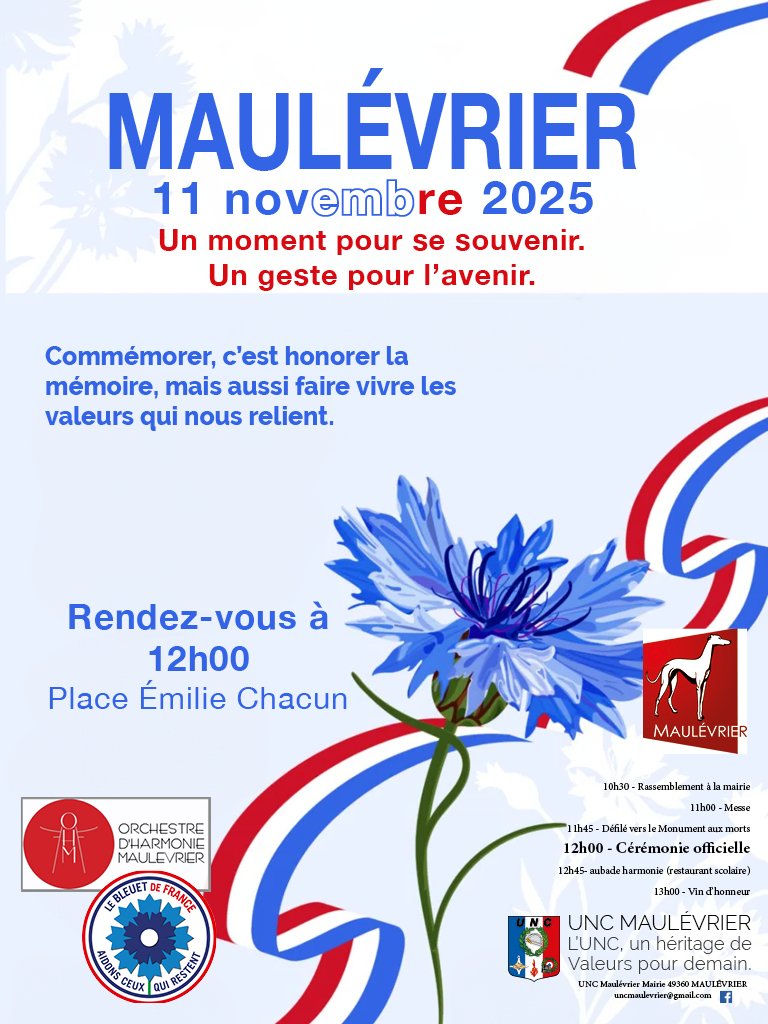 Ce Mardi 11 novembre, retrouvons-nous à 12h00 place Émilie Chacun pour partager un moment de mémoire et de respect avec l’UNC de Maulévrier.